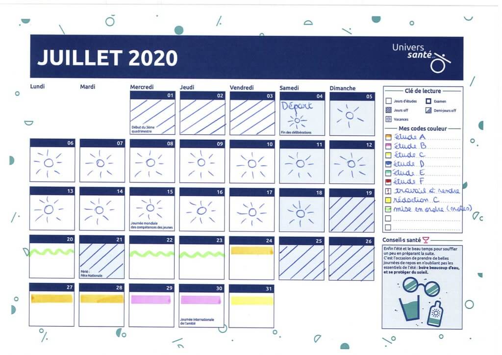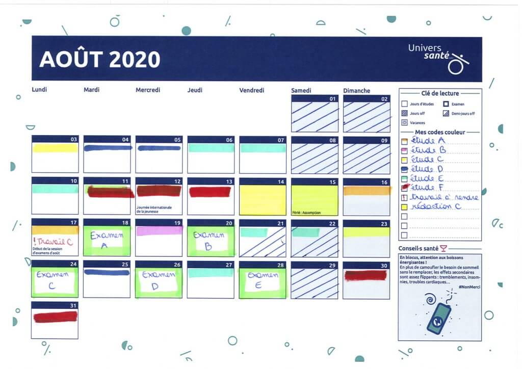 Dans un planning mensuel, il est nécessaire de laisser des jours « off », ou des demi-journées, pour souffler un peu ! Il peut aussi être utile d’alterner dans son étude des journées consacrées à un cours plus difficile, suivies de journées plus simples, pour ne pas surcharger son planning. Enfin, ce planning peut être adapté en cours de route si une matière donne un peu de fil à retordre ou, au contraire, a été finie rapidement.