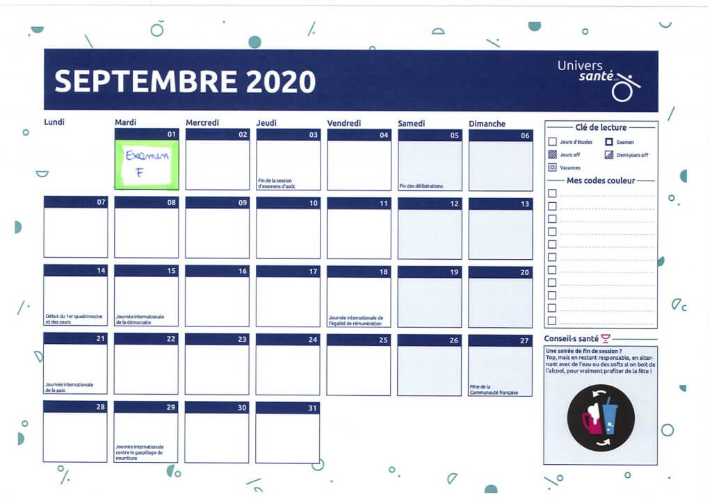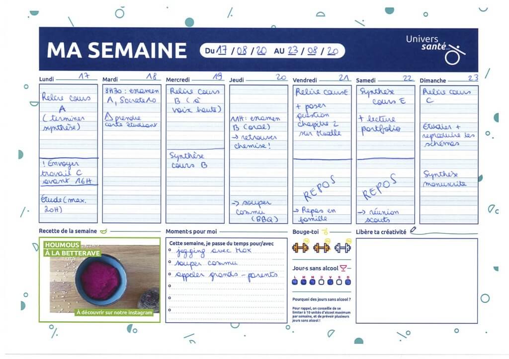 Pour s’organiser plus concrètement, le planning semaine par semaine, ou semainier, est un bon atout pour alterner étude et moments de détente. Dans ce planning que nous te proposons, nous avons prévu plusieurs encadrés pour prendre soin de toi : des fiches-recettes, que tu trouveras dans le pack à télécharger, mais aussi une « to-do list » pour prendre du temps avec d’autres ou pour toi-même, un coin « créativité » si tu aimes scribouiller (ou pour des notes), mais aussi des haltères à colorier à chaque moment sportif, ou encore des « jours sans alcool ».