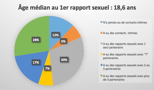 En ce qui concerne les expériences en matière de sexualité, les rapports sexuels ont été définis comme des activités sexuelles avec un(e) ou des partenaire(s) impliquant au moins une des pratiques suivantes : pénétration vaginale, pénétration anale ou rapports bucco-génitaux (fellation et/ou cunnilingus). Les contacts intimes sont eux définis comme des activités sexuelles avec un(e) ou des partenaire(s) n’impliquant aucune de ces pratiques.
